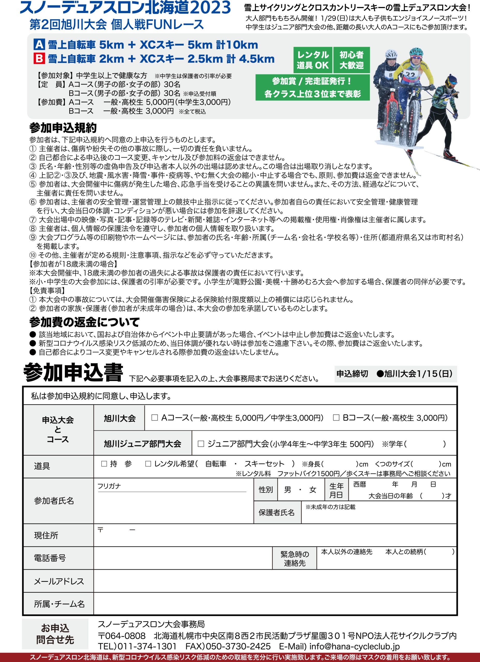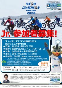 2023年1月29日(日)旭川市富沢クロスカントリースキー場にて開催する「第2回旭川大会」において、ジュニア部門大会を開催いたします!参加対象は小学4年生〜中学3年生までの児童・生徒の皆さんです。参加申込は、WEBフォームまたはFAX・郵送にて2023年1月15日(日) 22日(日)締切 です(定員30名※申込受付順)。参加賞には北海道の美味しい食材をプレゼント(^^)/