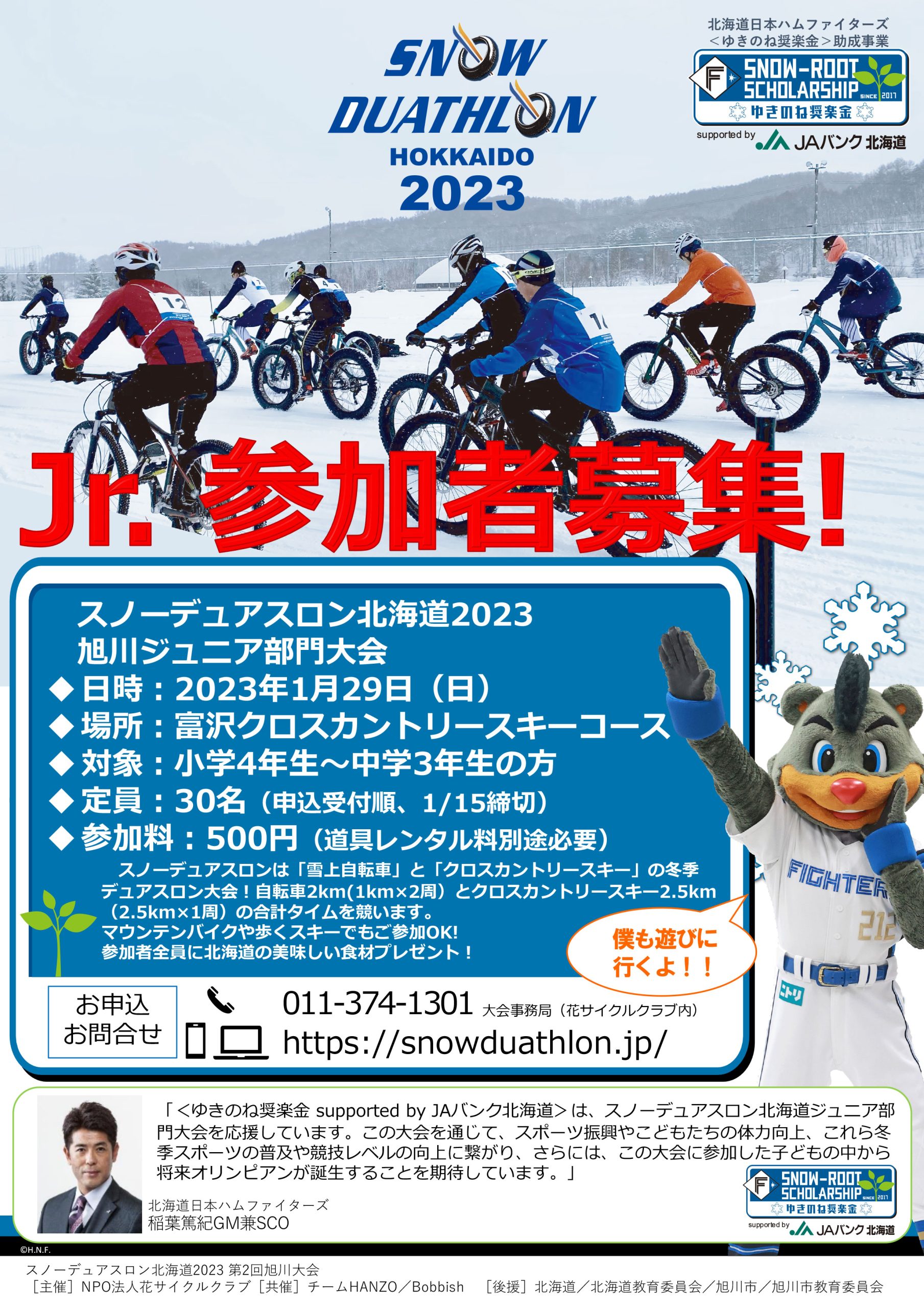 スノーデュアスロン北海道2023では、北海道の子どもたちに多様なスノースポーツへの参加・体験機会の提供を目的に、旭川大会にて「ジュニア部門大会」を、札幌・美幌・十勝めむろ大会にて「ジュニア向け体験会」を開催します。旭川ジュニア部門大会及び体験会は「ファイターズ ゆきのね奨楽金supported by JAバンク北海道 助成事業」のご協力を受けて実施いたします。