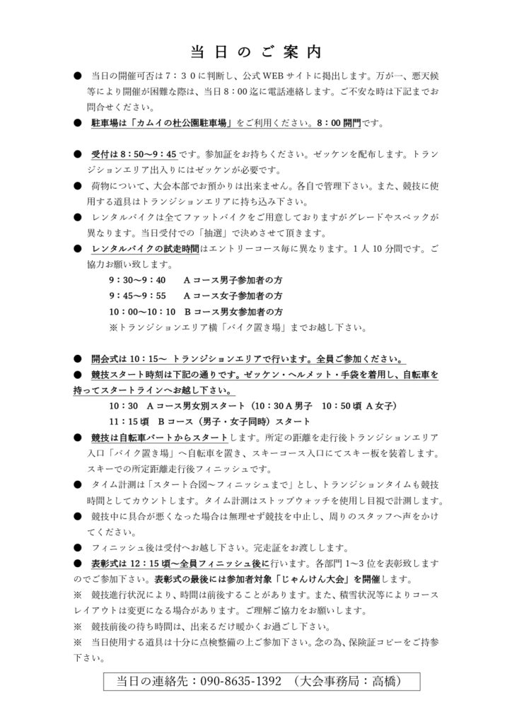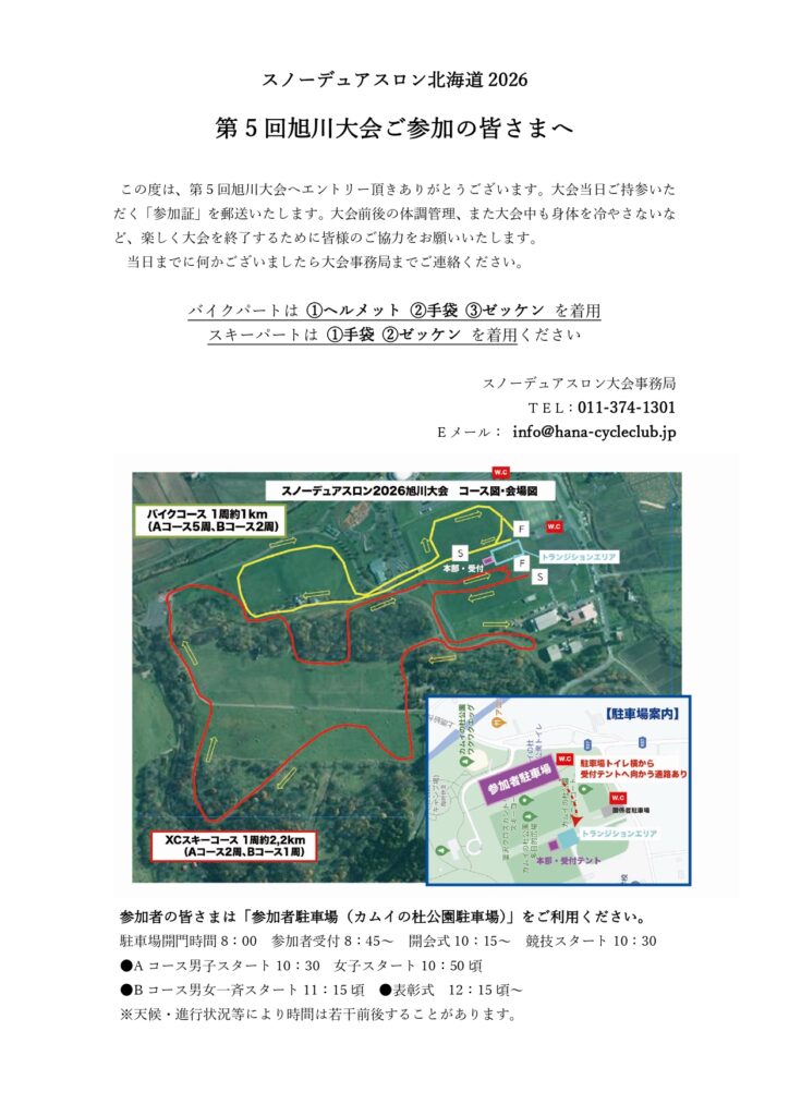 スノーデュアスロン北海道2026第5回旭川大会、当日のスケジュールをお知らせします。参加者の皆様には「参加証・当日のご案内」を郵送しました。万が一、木曜日までに届かない方がおりましたら事務局へご一報ください。当日のご案内は下記と同じものを郵送しています。