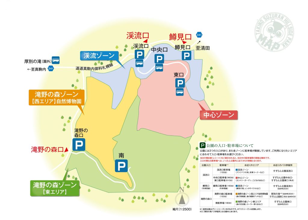 ● 公園入口は「滝野の森口」をご利用ください。駐車場は「南駐車場」が便利です。