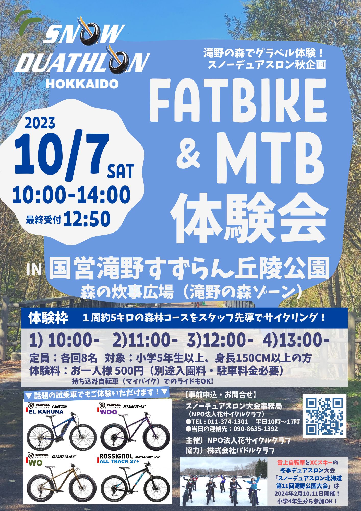 この秋も、スノーデュアスロン滝野公園大会の会場である国営滝野すずらん丘陵公園にて「ファットバイク&MTB体験会」を開催!
